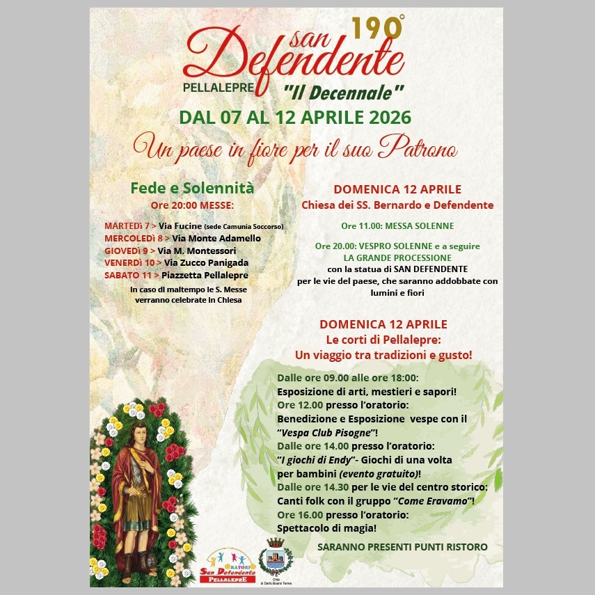 La comunità di Pellalepre celebra il 190° anniversario di San Defendente, patrono del paese, con un programma articolato che unisce momenti di profonda spiritualità a iniziative dedicate alla tradizione e alla convivialità. Per l’occasione, il paese si veste a festa, offrendo ai visitatori un’atmosfera suggestiva e ricca di significato.