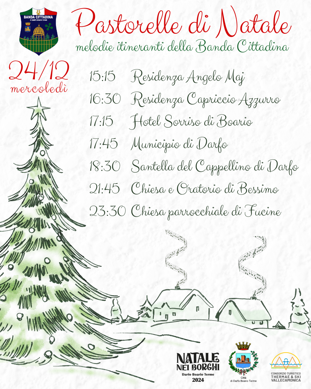 Mercoledì 24 dicembre, come di consueto, la Banda Cittadina allieterà la città con momenti musicali Natalizi