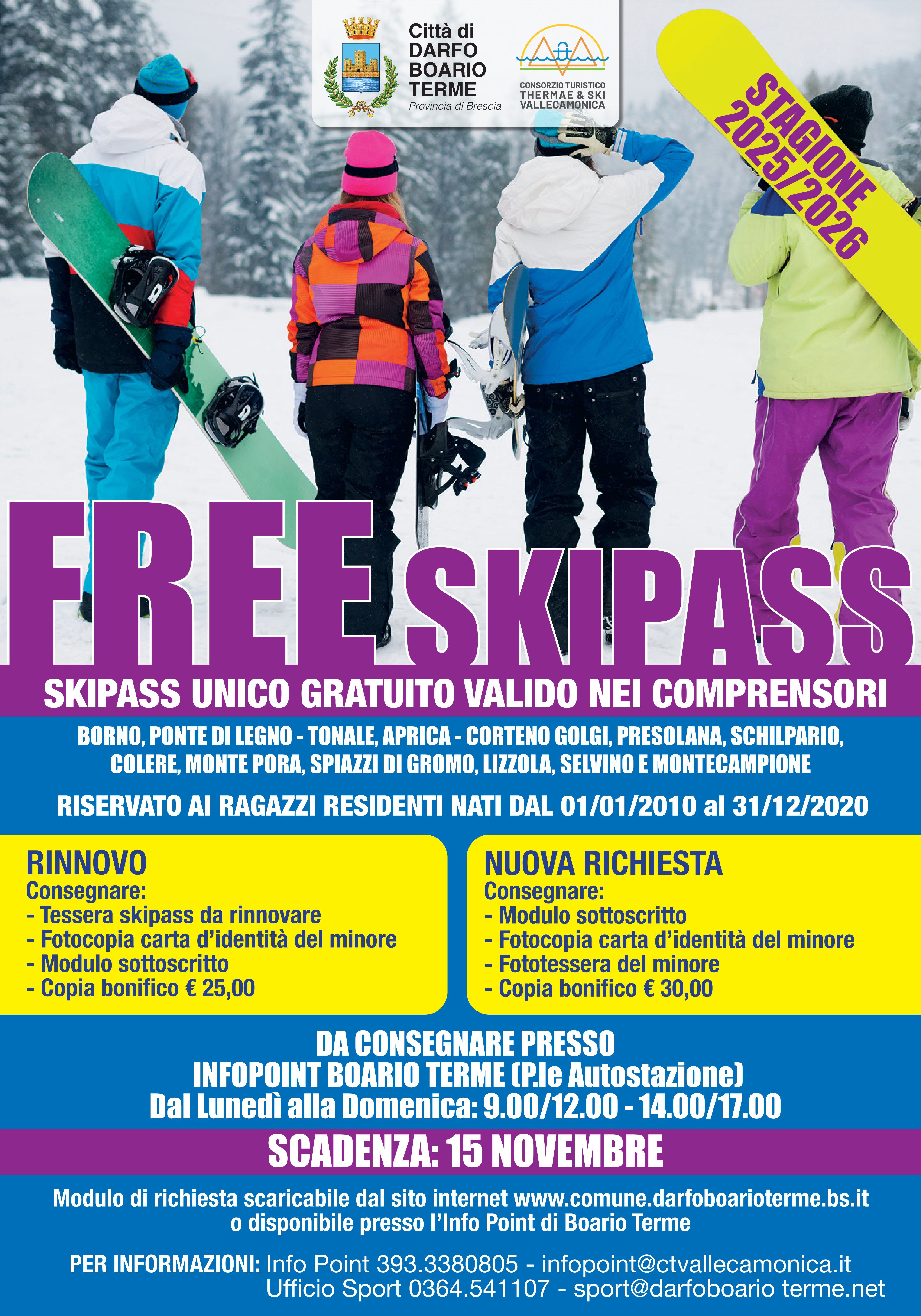 BONIFICO: IBAN IT25M0306954440100000046024 - Intestato a Comune di Darfo Boario Terme - Causale “Free Skipass 2025/2026”